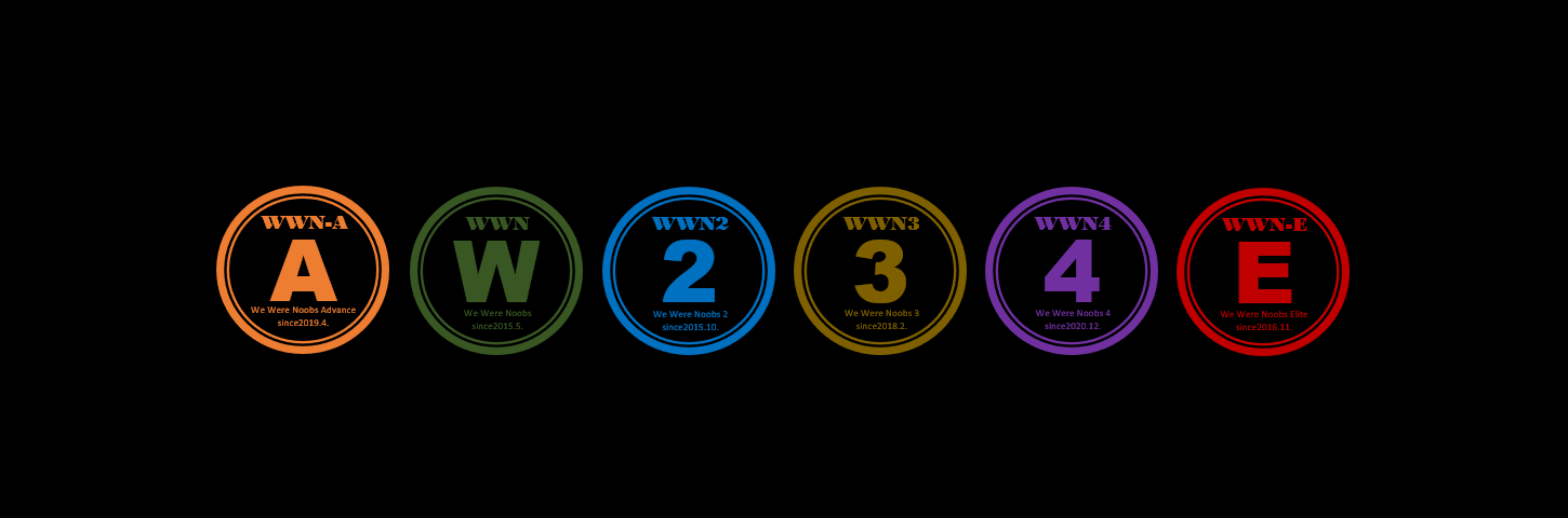 Aboutクラン | 【WWNグループの説明】 正式名称:We Were Noobs。 WWNグループは現在6クランで活動中です。 ●WWN、WWN2、WWN3、WWN4は初心者脱却や技術向上を楽しむクラン (2015年5月~)。 ●WWN-EはさらなるPSの向上、TBを楽しむクラン (2016年11月~)。 ●WWN-Aは成長を楽しむ育成クラン (2019年4月~)。 Lobiやディスコードで和気あいあいとコミュニケーションをとりつつ、クランイベント(内戦や交流戦など)を活発に実施しています。 また育成に力を入れるとともに、トナメにも積極的に参加しているグループです。 |